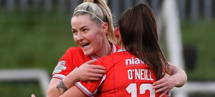 Victory in the Reds’ final home match of the campaign lifted the Champions back to the top of the Sports Direct Women’s Premiership but, regardless of what happens when fellow challengers Glentoran Women contest their game in hand tomorrow, the destination of the title will be determined when the top two lock horns at Blanchflower Stadium next Sunday.