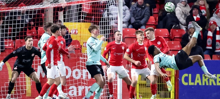 Forced to defend more intently after the break, a smart forward foray from the Reds saw Keevan Hawthorne cross for Conor Falls, whose header was touched on to the bar by Rohan Ferguson.